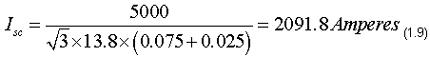 Note that the voltage base is not used in this case since the transformer impedance is the same referenced to either side. If we ignore the phase angle difference between the two impedances, we can calculate the short circuit current by adding the transformer plus the utility: